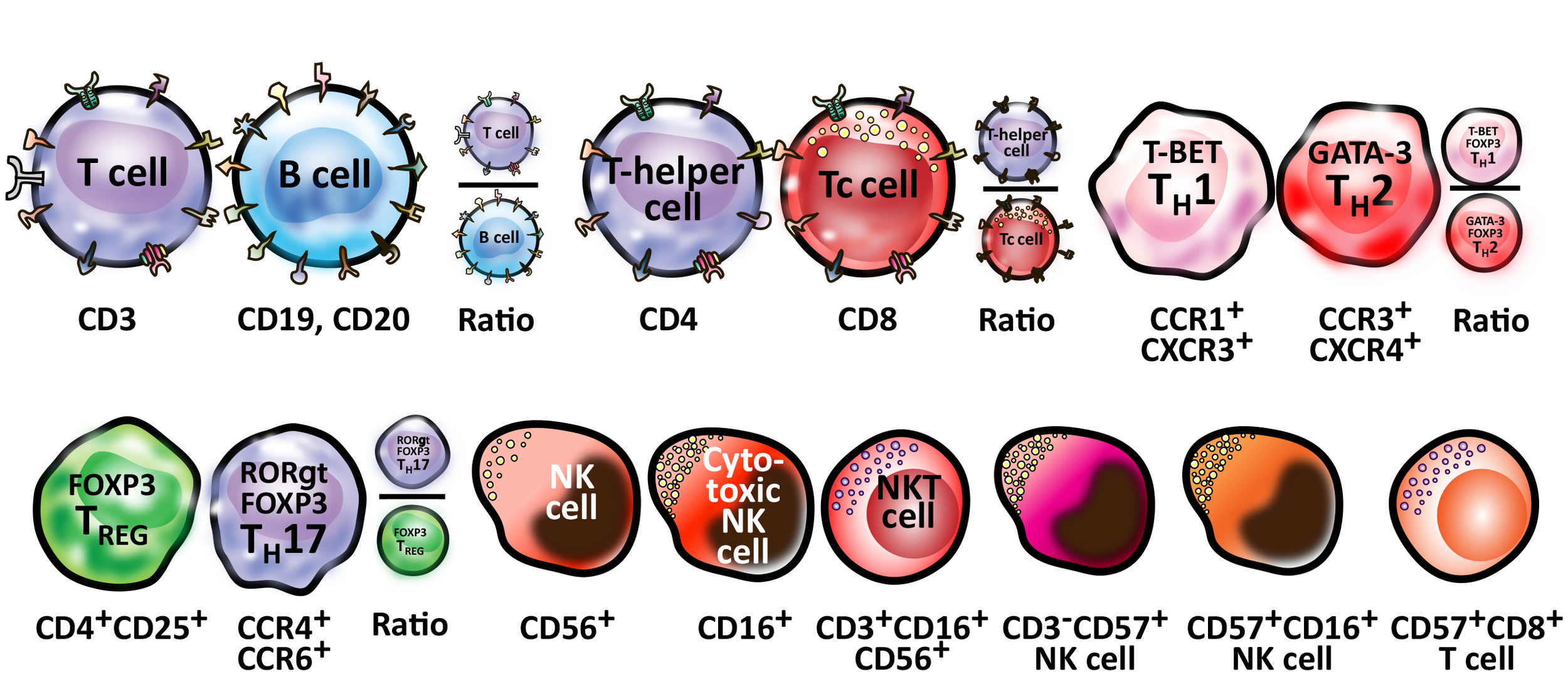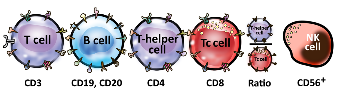 Lymphocytes and their subpopulations are the key elements of the immune system. In adults, they account for about 20-49% of the total number of white blood cells. It would be vitally important to measure decrease or increase in the percentage and number of these important lymphocytes. It is the numbers, ratios, percentages and activity level of these lymphocytes, and their subpopulations which are responsible for protection against various environmental factors, including viruses.